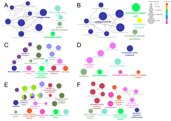 A GO enrichment analysis was performed for both the up-regulated and down-regulated proteins in each comparison group to determine differences in the bioinformatic profiles of dairy cow placental proteins extracted using different proteases. The GO enrichment results showed differences in the biological information of placental proteins extracted using different proteases. The statistically significant (p < 0.05) network analysis performed using Cytoscape is shown in Figure 6. The DEPs identified using papain were enriched in collagen trimer, the extracellular region, the extracellular exosome, the chromaffin granule membrane, and protein heterodimerization (Figure 6A,B). The DEPs identified using trypsin were enriched in blood microparticles, membrane regions, a complex of collagen trimers, extracellular organelles, the extracellular matrix, extracellular matrix components, the cell surface, the viral nucleocapsid, the regulation of locomotion, the maintenance of location, syncytium formation, and anatomical structure formation involved in morphogenesis (Figure 6C,D). The DEPs identified using pepsin were enriched in the I band, immunological synapse, sarcomere, costamere, contractile fibers, structural molecule activity conferring elasticity, extracellular matrix binding, coagulation, the structural constituent of muscles, the NAD metabolic process, the structural constituent of the extracellular matrix, the collagen metabolic process, platelet activation, the regulation of plasma lipoprotein particle levels, and the cell death response in oxidative stress (Figure 6E,F).