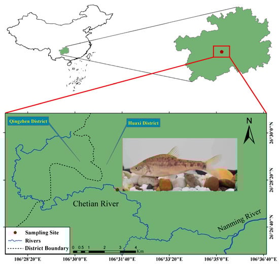 The freshwater fish genus Sinocyclocheilus (Fang, 1936) (Cyprinidae: Barbinae) is an endemic allotetraploid fish species [8] in China, mainly distributed in karst areas of southwest China, including Yunnan Province, Guizhou Province, Guangxi Zhuang Autonomous Region, and Hubei Province [9]. They are a typical cave-restricted animal that lives in dark underground environments. Over time, they have evolved to adapt to the cave environments through a variety of characteristic changes in morphology, behavior, and physiology [10]. To date, there are 78 effective species in the Sinocyclocheilus genus [11], which is the largest group of cyprinid fish in China. Nine species of Sinocyclocheilus are listed on the IUCN Red List of Threatened Species (https://www.iucnredlist.org/, accessed on 30 September 2023), including two critically endangered (CR), one endangered (EN), and six vulnerable (VU). Sinocyclocheilus multipunctatus was originally named Schizothorax multipunctatus by Jacques Pellegrin in 1931 [12]. Subsequently, the species was placed in the genus Sinocyclocheilus and renamed Sinocyclocheilus multipunctatus [13]. S. multipunctatus is mainly distributed in the Guiyang and Qiannan Buyei and Miao autonomous prefectures in China. S. multipunctatus is especially threatened by overfishing, water pollution, and habitat loss due to its limited distribution [14]. Currently, the species is rated as a near-threatened species in the Red List of China’s Vertebrates [15].