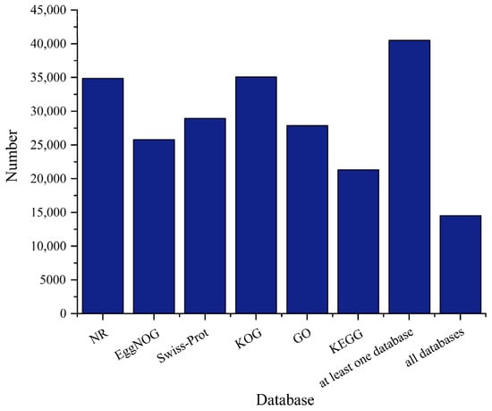 In order to obtain comprehensive information on gene function, the representative transcripts were annotated by searching the NR, EggNOG, Swiss-Prot, KOG, GO, and KEGG databases. In total, 35,076 (70.62%) transcripts were annotated in the KOG; 27,879 (56.13%) were annotated in the GO; 22,599 (45.50%) in the KEGG; 28,940 (58.26%) in the Swiss-Prot; 26,175 (52.70%) in the EggNOG; and 34,861 (70.18%) in the NR (Figure 2). A total of 40,487 (81.51%) transcripts were annotated in at least one database, and 14,514 (29.22%) transcripts were annotated in all databases.