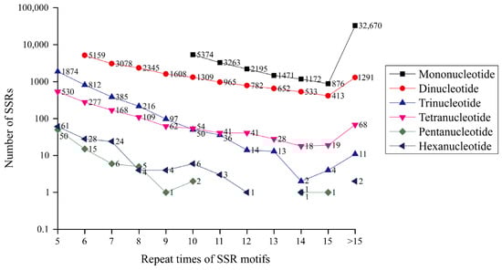 Summary of SSR types in the S. multipunctatus transcriptome. The X-coordinate is the repeat times of SSR motifs; the Y-coordinate is the number of SSR corresponding to the number of repeats of different repeat types. Different color shapes represent different types of SSRs.