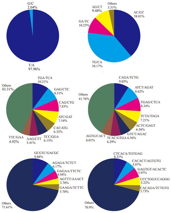 A total of 70,300 SSRs were identified from the total transcripts, of which 15,042 unique transcripts contained at least two SSRs. Mononucleotide was the leading repeat motif (47,021, 66.89%), followed by dinucleotide (18,135, 25.80%), trinucleotide (3514, 5.00%), and tetranucleotide (1415, 2.01%) (Figure 3). Only 81 (0.11%) and 134 (0.19%) SSRs were detected in pentanucleotide and hexanucleotide repeats, respectively. Among the mononucleotide SSRs, T/A accounted for 97.96% more than G/C (Figure 4). AC/GT (7039, 38.81%) was the richest motif in dinucleotide SSRs, followed by TG/CA (9926, 38.17%), and GA/TC (1855, 10.23%). For trinucleotide, tetranucleotide, pentanucleotide, and hexanucleotide SSRs, the most abundant motifs were TGA/TCA (359, 10.21%), CAGA/TCTG (128, 9.05%), GCGTC/GACGC (8, 9.88%) and CTCACA/TGTGAG (11, 8.21%), respectively (Figure 4).
