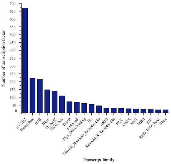 It was found that TFs bind specifically to the regulatory regions of the genome through a sequence and play an important role in regulating gene transcription [48]. In that recent study, 2384 TFs from 68 families were projected in total, including zf-C2H2, Homeobox, BTB, HLH and others. Among them, zf-C2H2 occupied the largest proportion; it, as a member of the zinc-finger protein family, can recognize DNA, RNA, proteins or lipids by binding with metalions, thus regulating the expression of a large number of functional genes [49]. This will provide a useful reference for future research on the regulatory mechanisms of transcription factors in biological processes.