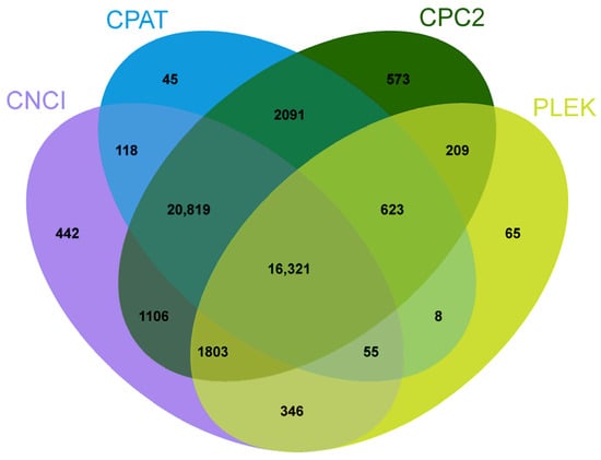 A total of 2384 TFs were identified, and the zf-C2H2 family (670) was the most represented, followed by the Homeobox family (222), BTB family (216), and HLH family (148) in our study (Figure 5). In total, 19,430, 41,010, 43,545 and 40,080 transcripts without protein-coding potential were identified by PLEK, CNCI, CPC2 and CPAT tools, respectively, and 16,321 overlapping transcripts were identified as assumed lncRNAs (Figure 6).