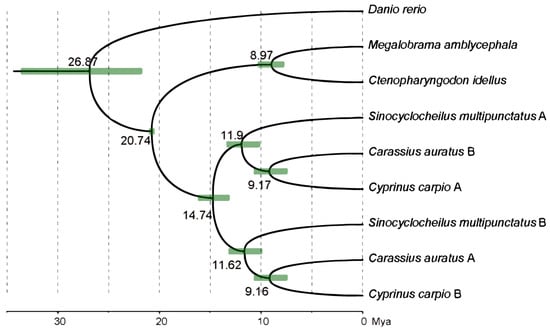 When the phylogenetic tree was constructed, CDS alignments of every single-copy family were concatenated to produce a super-matrix. RAxML [31] was used to construct the super-genes from the full-length and 4DTv sites, which performed to produce a maximum likelihood tree with the GTR + I + Γ model. The linked supergenes were divided into three regions corresponding to the 1st, 2nd, and 3rd codon sites in the CDS. Considering that the evolution rate of different codon positions is quite different, the three codon positions of the connected supergene were regarded as three distinct partitions. The MCMCTREE program in the PAML4.7 package [32] was supplied to estimate the divergence time under a relaxed clock model. The divergence times were calibrated with three calibrating points of zebrafish (Danio rerio) vs. common carp (Cyprinus carpio) ~55.8 Mya, grass carp (Ctenopharyngodon idellus) vs. common carp 20.5–20.95 Mya, and grass carp vs. Megalobrama amblycephala 9.1–22 Mya [33,34,35,36]. Based on the “Independent rates model (clock = 2)” and “JC69” model in MCMCTREE program, after the burn-in of 2,000,000 iterations, the MCMC process was run for 6,000,000 iterations. To confirm that the results were similar, each data type ran the program twice. FigTree v. 1.4.0 (http://tree.bio.ed.ac.uk/software/figtree, accessed on 12 January 2023) was used to produce the chronogram with the first run.