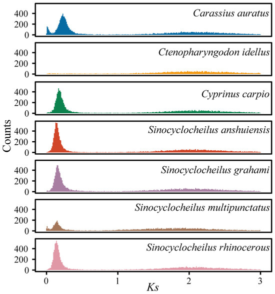 The transcriptome sequences of S. multipunctatus were compared with BLASTP (E-value < 1 × 10−5) to find conserved paralog sequences to detect polypoidization events in the transcriptome of S. multipunctatus. Protein sequences of Ctenopharyngodon idellus, Cyprinus carpio, Carassius auratus, and three Sinocyclocheilus species were also analyzed and used for comparison using the WGDdetector software (https://github.com/yongzhiyang2012/wgddetector, accessed on 12 January 2023) [37], which has shown high performance in detecting recent and ancient WGD events; for example, it was applied in the study of WGD events of Lautoconus ventricosus [38], Xenopus laevis [37], and Cyamopsis tetragonoloba [39]. The protein and CDS sequences within each gene family were automatically compared using MAFFT [40] and PAL2NAL [29], and assigned the corresponding Ks values to each pair of similar sequences (gap-stripped comparison length > 90 bp) within each gene family based on the Nei–Gojobori algorithm. Then, the whole-genome duplication (WGD) events of each species were estimated based on the Ks distributions. The Ks values were transferred to the divergence time by the following formula T = Ks/2r, where r refers to the substitution rate used by S. grahami [41], 5.7–6.4 × 10−9 mutations per site per year [42].