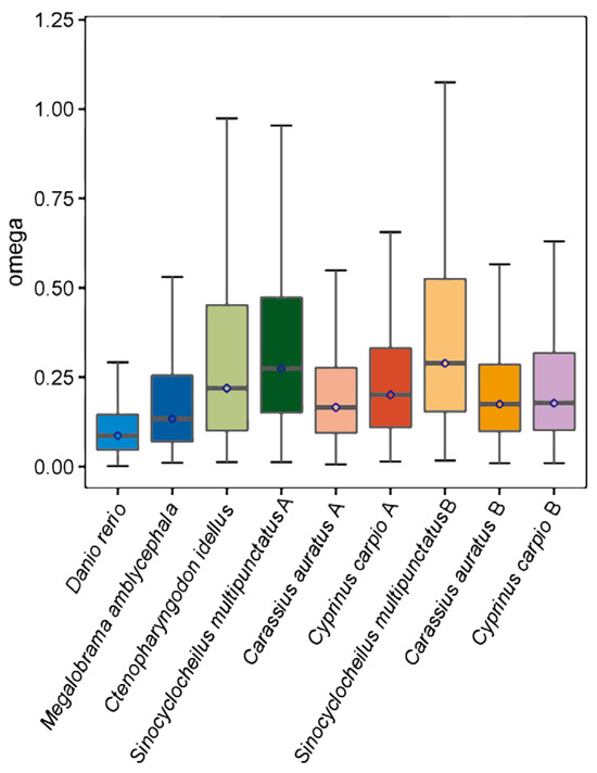 To evaluate the overall evolutionary rates based on concatenated alignments of all orthologues, we employed CodeML to calculate substitution rates (Ka and Ks) for each orthologue based on the use of the free ratio model. The Ka/Ks ratio level revealed the Ka/Ks ratio of the B-subgenome of S. multipunctatus lineage was higher than the other species (Figure 9), indicating that S. multipunctatus are evolving at a faster rate than other cyprinid species.