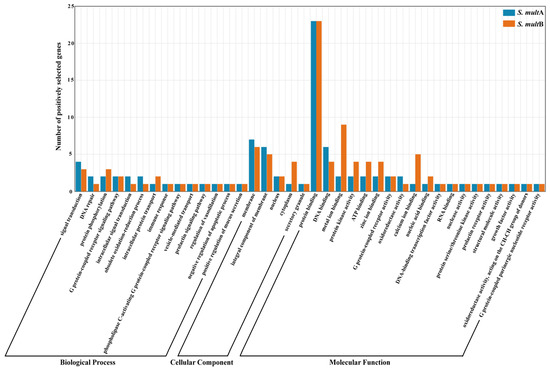 We used this model in CodeML to obtain the positively selected genes (PSGs) in codons along the S. multipunctatus sequences. A total of 220 PSGs were identified in the A-subgenome and B-subgenome of S. multipunctatus, and the GO functional annotation analysis showed that there were PSGs in all three GO terms. Meanwhile, the number of PSGs in the B-subgenome was more than that in the A-subgenome, while the number of PSGs in the cellular component (CC) was less than that in biological process (BP) and molecular function (MF) (Table S1). We classified the PSGs in the A-subgenome and B-subgenome of S. multipunctatus by GO categories and drew the distribution of GO term classifications of PSGs among the same GO categories (Figure 10). GO categories “signal transduction”, “DNA repair” and “protein phosphorylation” (in BP); “membrane”, “integral component of membrane” and “cytoplasm” (in CC); and “protein binding”, “DNA binding” and “metal ion binding” (in MF) contained the largest percentage of genes. In addition, the subgenomes A and B of S. multipunctatus also have different GO term descriptions, such as, “regulation of DNA-templated transcription” (in BP) and “sequence-specific DNA binding” (in MF), and were significantly enriched in A-subgenome, and these PSGs of B-subgenome were significantly enriched in “proteolysis” (in BP), “extracellular region” (in CC) and “cysteine-type peptidase activity” (in MF) (Table S1). These GO term descriptions indicated that the PSGs play key roles in the biological functions and environmental adaptations of S. multipunctatus.
