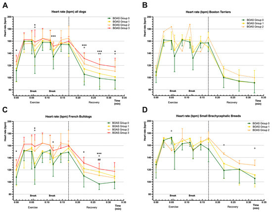 Mean ± SD of heart rate (HR; beats per minute, bpm) of all dogs ((A); n = 72), Boston Terriers ((B); n = 28), French Bulldogs ((C); n = 32), and small brachycephalic breeds ((D); n = 12), subdivided into brachycephalic obstructive airway syndrome (BOAS) groups (coloured lines). HR was recorded at rest (time point 0), during exercise, and during recovery period. The dotted vertical line separates the exercise and the recovery periods. The dotted HR line of BOAS group 2 in (B) is attributed to a sample size of n = 1 (excluded from statistical analysis). Significant differences derived from two-way ANOVA and Dunnett’s multiple comparisons are marked with hashtags (## = p < 0.01) for BOAS group 0 versus BOAS group 1, with circles (° = p < 0.05; °° = p < 0.01) for BOAS group 0 versus BOAS group 2, and with asterisks (* = p < 0.05; *** = p < 0.001) for BOAS group 0 versus BOAS group 3.
