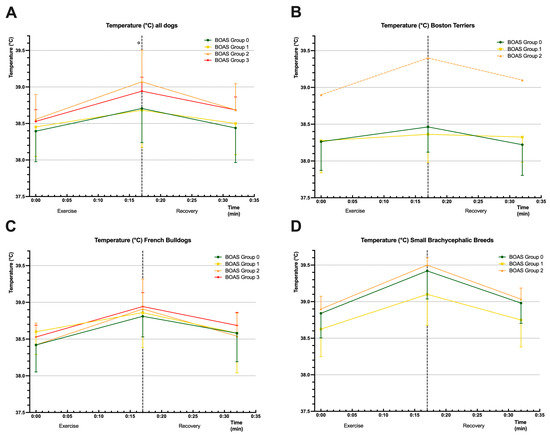 The evaluation of whether the BOAS degree had an impact on the body temperature during the exercise test and recovery is shown in Figure 2. When analysing all dogs, a significant difference was found only after the exercise period between BOAS groups 0 and 2 (p = 0.0428). No significant effects or differences were observed when analysing breed groups. See Figure 2 for further details.
