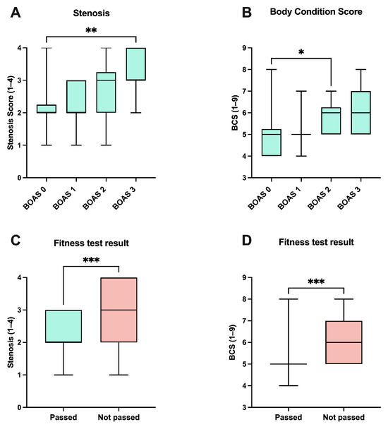 Box and whisker plots with corresponding medians are shown. (A) shows the stenosis of nostrils (Scores 1–4), and (B) shows the body condition score (BCS) (Scores 1–9) in relation to brachycephalic obstructive airway syndrome (BOAS) groups, respectively (group 0: n = 34; group 1: n = 17; group 2: n = 14; and group 3: n = 7). (C,D) show stenosis scores and BCS in relation to the fitness test results (passed, n = 49; not passed, n = 23), respectively. In (A,B), the Kruskal–Wallis test (p = 0.0039 and p = 0.0127) followed by Dunn’s multiple comparisons tests (** = p < 0.01 and * = p < 0.05) was used to assess the parameter stenosis scores and BCS between BOAS group 0 and the other groups, respectively. In (C,D), Mann–Whitney tests were used for the comparison between the “passed” and “not passed” groups for the parameter stenosis scores and BCS, respectively (*** = p < 0.001).