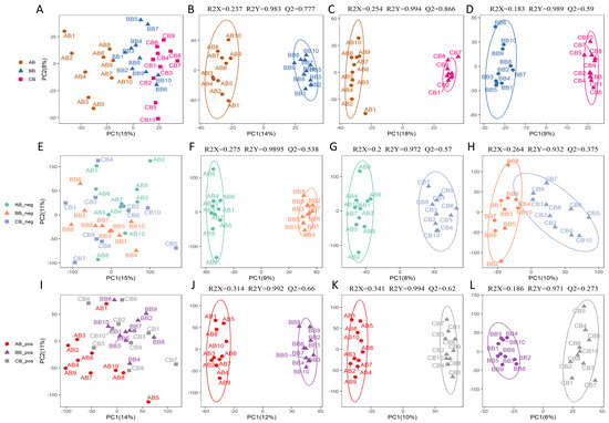 Multivariate statistical analysis of metabolites in breast meat of Beijing-You chicken at 90, 120, and 150 d. (A–D) Metabolites detected via GC-MS; (E–H) metabolites detected via LC-MS in negative mode; (I–L) metabolites detected via LC-MS in positive mode. (A,E,I) PCA plot based on all metabolites; (B–D,F–H,J–L) OPLS-DA plot based on all metabolites; AB, BB, and CB: breast meat samples from Beijing-You chicken at 90, 120, and 150 d, respectively.