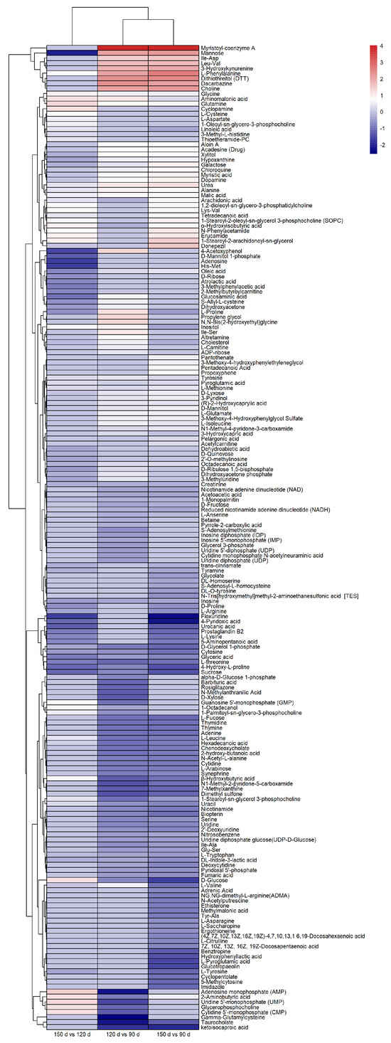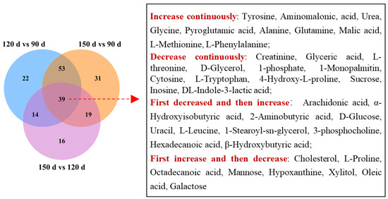 The metabolites found in all three comparison groups were affected by age continuously, which was worthy of our further attention. There were 39 common metabolites present in all comparison groups (Figure 4). The concentration trend of those overlapped metabolites was analyzed according to fold changes. It was found that 10 metabolites (tyrosine, aminomalonic acid, urea, glycine, pyroglutamic acid, alanine, glutamine, malic acid, methionine, phenylalanine) increased with age. Meanwhile, 11 metabolites (creatinine, glyceric acid, threonine, d-glycerol 1-phosphate, 1-monopalmitin, cytosine, tryptophan, 4-hydroxy-l-proline, sucrose, inosine, dl-indole-3-lactic acid) decreased with age. In addition, arachidonic acid, α-hydroxyisobutyric acid, 2-aminobutyric acid, uracil, leucine, 1-stearoyl-sn-glycerol 3-phosphocholine, hexadecanoic acid, and β-hydroxybutyric acid showed the lowest concentration at 120 d. On the contrary, cholesterol, l-proline, octadecanoic acid, mannose, hypoxanthine, xylitol, oleic acid, and galactose showed the highest content at 120 d.