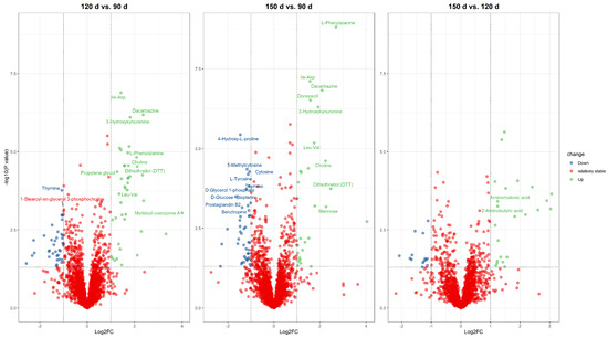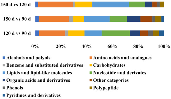 The differential metabolites were identified based on the criteria of VIP scores (VIP > 1) as well as the t-test (p < 0.05). For LC-MS, a total of 171 and 166 compounds that differed between the age groups were identified based on the positive mode and negative mode, respectively. The metabolites from the positive and negative mode were integrated for a concise presentation in the following analysis. In the comparison group of 120 d vs. 90 d, 42 and 90 metabolites with significant differences were screened in GC-MS and LC-MS, including 4 metabolites detected using both approaches (Table 4 and Table S3, Figure 2). That is, there were 128 differential metabolites between 120 d and 90 d. For the group of 150 d vs. 90 d, there were 46 and 103 differential metabolites in GC-MS and LC-MS, with 7 overlapped. In addition, 88 unique metabolites and 1 overlapped metabolite were found to differ between 150 d and 120 d, including 40 from GC-MS and 49 from LC-MS. Additionally, the categorization of differential metabolites was performed. Those metabolites were mainly summarized into 11 categories, of which amino acids and their analogs, lipids, and lipid-like molecules were the major ones (Figure 3).