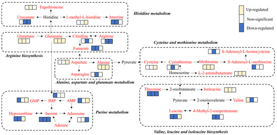 There were 20 pathways significantly enriched in breast meat, of which 6 pathways were related to flavor formation: arginine biosynthesis, valine, leucine, and isoleucine biosynthesis, histidine metabolism, alanine, aspartate, and glutamate metabolism, purine metabolism, and cysteine and methionine metabolism (Figure 6).