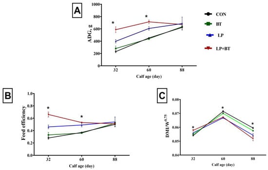 Figure 1. Changes in average daily gain (ADG, A), feed efficiency (B), and dry matter intake per kilogram of BW0.75 (C) in pre-weaned calves supplemented without (CON group) or with Bacillus toyonensis (BT) at a dosage of 3 × 109 cfu/calf/day, Lactobacillus plantarum (LP) at a dosage of 1 × 1010 cfu/calf/day, and their combination (LP + BT) at half the dosage for each from day 4 to day 88 of age. Error bars indicate the SEM; *, p < 0.05.