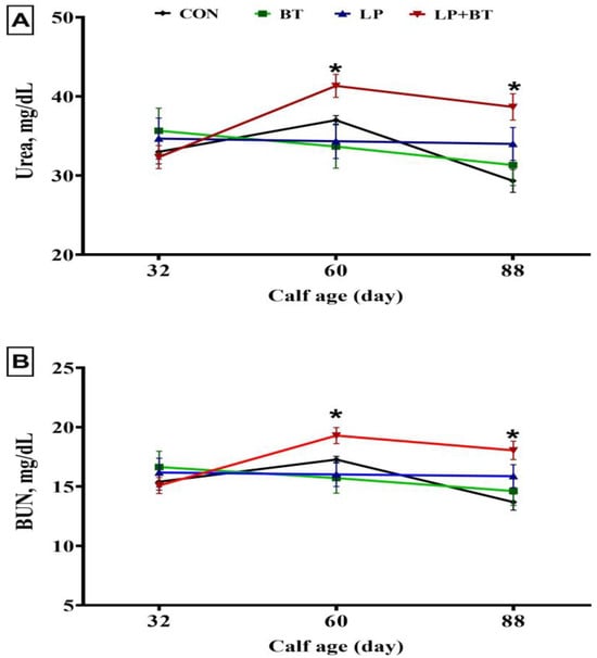 Figure 2. Changes in concentrations of blood urea (A) and urea nitrogen (BUN, (B)) in pre-weaned calves supplemented without (CON group) or with Bacillus toyonensis (BT) at a dosage of 3 × 109 cfu/calf/day, Lactobacillus plantarum (LP) at a dosage of 1 × 1010 cfu/calf/day, and their combination (LP + BT) at half the dosage for each from day 4 to day 88 of age. Error bars indicate the SEM; *, p = 0.066.