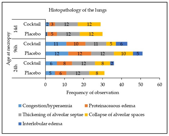 No significant abnormalities were identified in the conchae, palatine tonsils, paraepiglottal tonsils or retropharyngeal tonsils in either the placebo or cocktail treated groups (Supplementary Tables S4–S7). In the lungs, a number of abnormalities were identified in samples across both treatment groups. These included the observation of diffuse moderate congestion/hyperaemia, diffuse flooding with proteinaceous oedema and collapse of alveolar spaces, which are often associated with euthanasia. Other abnormalities included mild to moderate thickening of the alveolar septae with neutrophils and lymphocytes and mild to moderate interlobular oedema, these changes are indicative of an inflammatory process. These findings are summarised in Figure 1. There was no difference in the frequency of abnormalities between the two treatment groups at any time-point (24 h, 96 h or 14 d; p > 0.05).