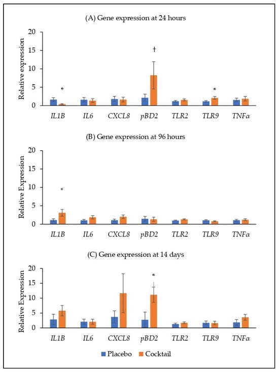 Relative gene expression in the nasal conchae at (A) 24 h, (B) 96 h and (C) 14 days post placebo/cocktail administration. IL1β, interleukin 1 beta; IL6, interleukin 6; CXCL8, C-X-C motif chemokine ligand 8/interleukin 8; pBD2, porcine beta defensin 2; TLR2, toll-like receptor 2; TLR9, toll-like receptor 9; TNFα, tumour necrosis factor alpha. Significant differences between treatments are indicated as * (p < 0.05) and † (p < 0.10).