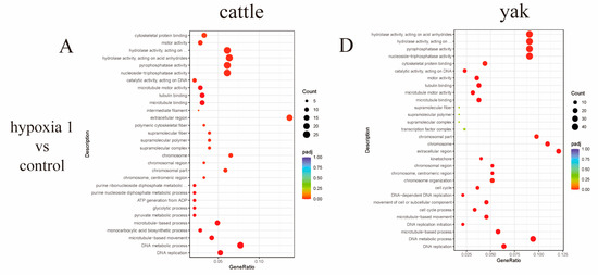 Scatterplot of GO enrichment analysis under gradient oxygen concentration. The horizontal coordinate of the graph is the ratio of the number of differential genes annotated with the GO term to the total number of differential genes, and the vertical coordinate is the GO term. (A–C) Scatterplot of GO enrichment analysis of cattle PASMCs under hypoxia 1 vs. control, hypoxia 10 vs. control, and hypoxia 10 vs. hypoxia 1; (D–F) scatterplot of GO enrichment analysis of yak PASMCs under hypoxia 1 vs. control, hypoxia 10 vs. control, and hypoxia 10 vs. hypoxia 1. The omitted part of the figure is: hydrolase activity, acting on acid anhydrides, in phosphorus-containing anhydrides; purine ribonucleoside diphosphate metabolic process; purine ribonucleoside diphosphate metabolic process; oxidoreductase activity, acting on single donors with incorporation of molecular oxygen; hydrolase activity, acting on acid anhydrides.