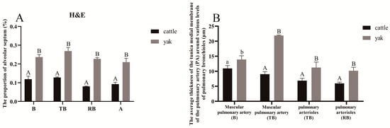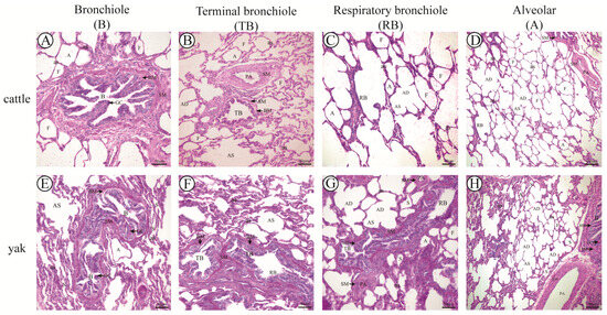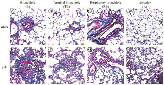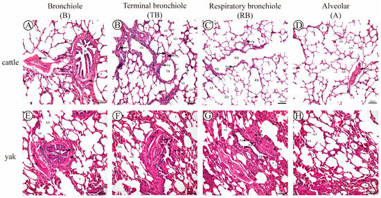 - Wei, Q.; Yu, H.X.; Zhang, Q.W.; Li, L.; Jin, H.X.; Niu, H.L.; Xue, Q.; Liang, L. Observation and comparison of alveolar tissue structure of highland yak. Heilongjiang Anim. Husb. Vet. Med. 2011, 9, 47–49. (In Chinese) [Google Scholar]