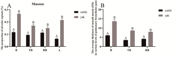 Analysis of data from H&E measurements of fine bronchioles at all levels of the lungs in adult cattle and yaks. (A) The proportion of alveolar septa in H&E staining of various levels of pulmonary bronchioles in adult cattle and yaks; (B) the average thickness of the accompanying pulmonary artery tunica medial at various levels of the pulmonary bronchioles in adult cattle and yaks. Different letters indicate significant differences, capital letters indicate extremely significant differences (p < 0.01), lowercase letters indicate significant differences (p < 0.05), and the same letters indicate no significant difference (p > 0.05); n = 3.
