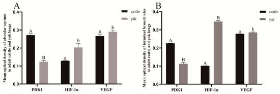 Zhang, Y.; Zhou, M.; Liang, Y.; Li, R.; Zhang, L.; Chen, S.; Yang, K.; Ding, H.; Tan, X.; Zhang, Q.; et al. Study of Transcriptomic Analysis of Yak (Bos grunniens) and Cattle (Bos taurus) Pulmonary Artery Smooth Muscle Cells under Oxygen Concentration Gradients and Differences in Their Lung Histology and Expression of Pyruvate Dehydrogenase Kinase 1-Related Factors. Animals 2023, 13, 3450. https://doi.org/10.3390/ani13223450