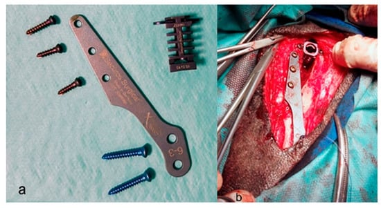 The patient is positioned in lateral recumbence with the damaged stifle directly on the table. A medio-proximal approach to the tibia is performed. The incision starts over the patella and runs 1 cm distally to the end of the tibial tuberosity, and the proximal tibia is exposed. After drilling a distraction hole, an osteotomy is performed using a cutting guide. Then, the tibial tuberosity is slowly advanced distracting 1 mm per minute to avoid breakage. After this, the appropriate porous titanium wedge is placed to avoid cranial thrust. The wedge should be placed a few millimeters distally to the proximal aspect of the tuberosity. Finally, the plate is placed, fixing the tuberosity to the tibial diaphysis (Figure 2a,b) [19].