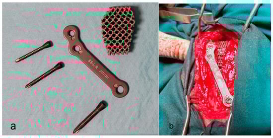 Finally, a 2.0 mm drill bit is used to fix the distal plate to the tibial shaft. The previously collected cancellous bone is now placed in the osteotomy gap (Figure 1a,b) [9].