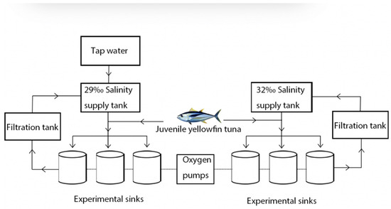 The Lingshui Research Station provided the juvenile yellowfin tuna, Tropical Aquatic Research and Center, South China Sea Fisheries Research Institute, Chinese Academy of Fisheries Sciences, China. The body length is 28.97 ± 2.17 cm, and the body weight is 646.52 ± 66.32 g. Seventy-two juvenile yellowfin tuna were randomly placed in six 5000 L fiberglass tanks equipped with a recirculating filtered seawater system for a 7-day period of domestication. Fresh miscellaneous fish pieces (4 cm × 2 cm) were fed daily from 08:30 to 09:00 at 5–8% of body weight per day. No feeding was provided the day before and during the experiment. The experimental installation was divided into a fiberglass water tank, a supply tank, a filtration basin, a circulating water control system, and an oxygen pump. To maintain the water temperature, salinity, and light control, automatic water changes were carried out through the electrical control system. During the experiment, each fiberglass tank was supplied with filtered seawater at a water exchange rate of 300% of the daily tank capacity. Each experiment was replicated three times with 32‰ as the control group and 29‰ as the pressure group (Figure 1).