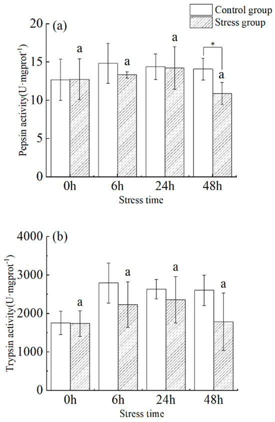 Under stress, pepsin activity increased with time from 0 h to 48 h (Figure 2a). There was no significant difference between 0 h and 48 h (p > 0.05), and the maximum value occurred at 24 h (14.208 ± 2.774 U·mg protein−1), followed by a decrease to a minimum value (10.887 ± 1.440 U·mg protein−1) at the 48 h. Pepsin activity in fish from the stress group was significantly lower than that of the control group at 6 and 48 h (p < 0.05).