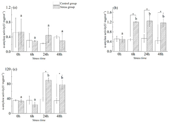 Effect of acute hyposalinity stress on α-amylase activity in juvenile yellowfin tuna (Thunnus albacares), (n = 9). α-Amylase activity values of yellowfin tuna stomach tissue (a), foregut tissue (b), and pyloric ceca tissue (c). At the same salinity, different letters at different time points indicate a significant difference (p < 0.05). Different letters indicate differences in experimental groups at different times, and * indicates differences between the experimental or control groups.