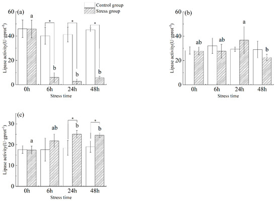 Effect of acute hyposalinity stress on lipase activity in juvenile yellowfin tuna (Thunnus albacares), (n = 9). Lipase activity values of yellowfin tuna stomach tissue (a), foregut tissue (b), and pyloric ceca tissue (c). At the same salinity, different letters at different time points indicate a significant difference (p < 0.05). Different letters indicate differences in experimental groups at different times, and * indicates differences between the experimental or control groups.