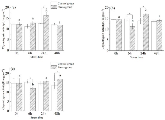 As shown in Figure 5, the chymotrypsin activity in the stomach (Figure 5a) of juvenile yellowfin tuna showed a trend of increasing (34.3%) and then decreasing (−38.1%), and the chymotrypsin activity in the stomach was significantly higher in the stress group compared to the control group before 24 h (p < 0.05) and stabilized at 48 h. The chymotrypsin activity in the stomach reached a maximum at 24 h (16.22 ± 0.81 U·mg protein−1) and was significantly higher than in the control group (p < 0.05). Chymotrypsin activity in the foregut (Figure 5b) of juvenile yellowfin tuna in the stress group fluctuated slightly from 0 h to 48 h with increasing stress time, with a significant difference between 6 h and 24 h (p < 0.05). The chymotrypsin activity in the pyloric ceca (Figure 5c) of juvenile yellowfin tuna experienced a trend of decreasing (−22.4%) and then increasing (39.7%), reaching a minimum value (12.05 ± 0.55 U·mg protein−1) at 6 h. The differences in chymotrypsin activity at 24 and 48 h were statistically significant (p < 0.05) compared to the control group, the chymotrypsin activity of each digestive organ was ranked as follows: pyloric ceca > foregut > stomach.
