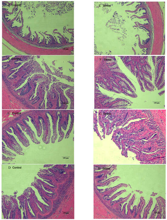 Tissue sections of the foregut of each experimental and stress group are shown in Figure 6. The foregut villi were well developed from 6 h–48 h in all experimental groups, and there was no significant difference in villi density. In Figure 6A, the villi appeared sparse, and the intestinal folds were slightly shorter than those in groups B, C, and D, but they were all tightly arranged and morphologically intact. The foregut in the stress group was similar to that of the experimental group, with a few villi having blurred margins and being more closely arranged.
