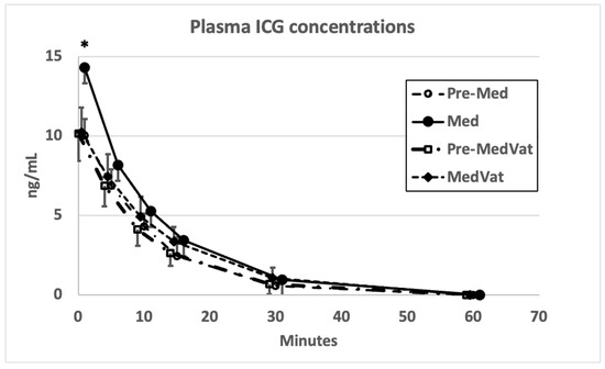 Plasma ICG concentrations in eight dogs while conscious (Pre-Med = prior to medetomidine and Pre-MedVat = prior to medetomidine–vatinoxan) and sedated (Med = after medetomidine and MedVat = after medetomidine–vatinoxan). Error bars indicate standard deviations. * denotes p < 0.05 significant difference between Med and Pre-Med.