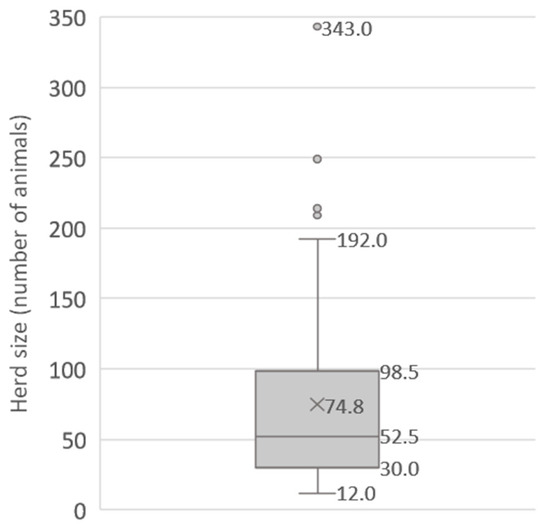 A total of 94 commercial dairy farms, comprising both cattle and buffaloes, were enrolled in the study. Out of the 94 farms, 44 farms exclusively had cattle, 39 farms had a mix of buffaloes and cattle, and 11 farms solely had buffaloes. The mean herd size of the participating farms was 74.8 bovines (SD = 65.5; range = 12–343). Figure 1 shows the distribution of the selected dairy farms according to their herd size. The median herd size was 52.5 animals, and 75% of the farms (below the upper quartile) had less than 100 animals.