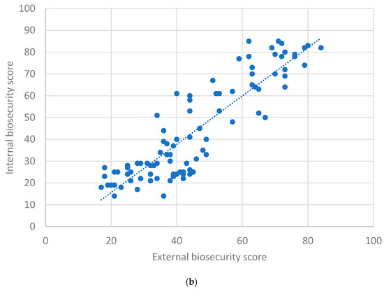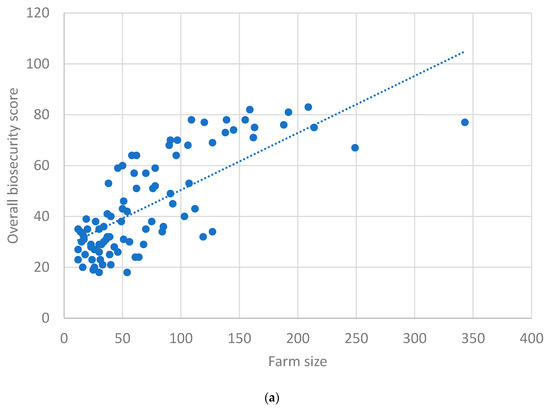 (a) Scatter plot between farm size and overall biosecurity scores. (b) Scatter plot between external and internal biosecurity scores.