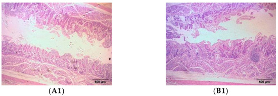 Histomorphology of intestinal segments in fattening sheep fed with MHB diet. (A) CON, (B) MHB; (1) Duodenum, (2) Jejunum, (3) Ileum, (4) Cecum, (5) Colon, (6) Rectum.