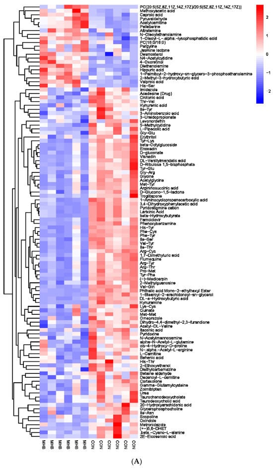 Hierarchical cluster analysis of rumen metabolites in fattening sheep. (A) Hierarchical clustering analysis of MHB groups in cationic mode, (B) hierarchical cluster analysis of MHB Group in anionic mode. Note: The horizontal axis represents different experimental groups, the vertical axis represents the differential metabolites compared in the group, the blue color block represents the relative expression level of the corresponding position metabolites is down regulated, and the red color block represents the up regulation.