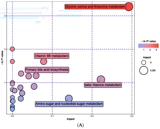 Pathway analysis of serum metabolomics. (A) Pathway analysis of MHB group serum in cationic mode, (B) pathway analysis of MHB group serum under anionic mode.