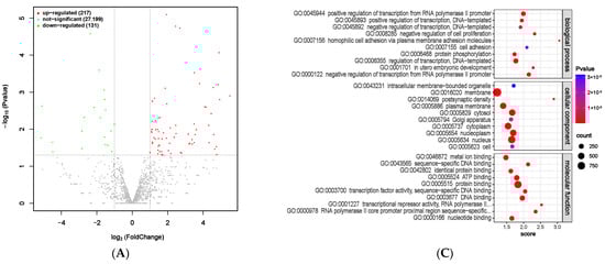 Differential expression analysis of miRNA between MHB group and CON group. (A) Volcano map of miRNA expression differences between MHB group and CON group. (B) MHB group and CON group differentially expressed miRNA GO annotation classification histogram. (C) The functional scatter plot shows a significant difference in miRNA enrichment between the MHB group and the CON group, with a top 10 × 3 degree (biological process, cellular component, and molecular function each with a top 10 degree).