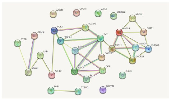 - Szklarczyk, D.; Kirsch, R.; Koutrouli, M.; Nastou, K.; Mehryary, F.; Hachilif, R.; Gable, A.L.; Fang, T.; Doncheva, N.T.; Pyysalo, S.; et al. The STRING database in 2023: Protein-protein association networks and functional enrichment analyses for any sequenced genome of interest. Nucleic Acids Res. 2023, 51, D638–D646. [Google Scholar] [CrossRef]