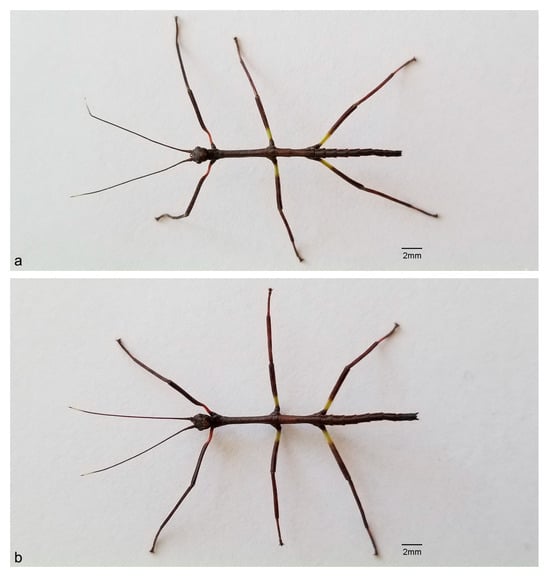 - Costa, J.; Mallet, J.R.S.; Takiya, D.M. Cladomorphus petropolisensis, a New Species of Stick Insect from the Atlantic Forest, Rio de Janeiro, Brazil. Animals 2022, 12, 2871. [Google Scholar] [CrossRef] [PubMed]