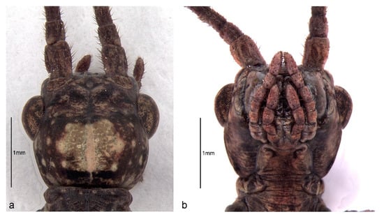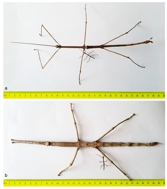 - Brock, P.D. Studies on the Australasian stick-insect genus Extatosoma Gray (Phasmida: Phasmatidae: Tropoderinae: Extatosomatini). J. Orthoptera Res. 2001, 10, 303–313. [Google Scholar] [CrossRef]