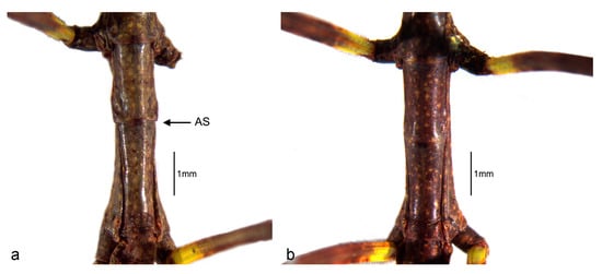 - Heleodoro, R.A. The first two cases of antisymmetry in the male genitalia of Phasmatodea reveal a new species of Isagoras Stål, 1875 (Phasmatodea: Pseudophasmatidae: Xerosomatinae) from the Brazilian Atlantic Forest. Zool. Anz. 2022, 296, 161–178. [Google Scholar] [CrossRef]