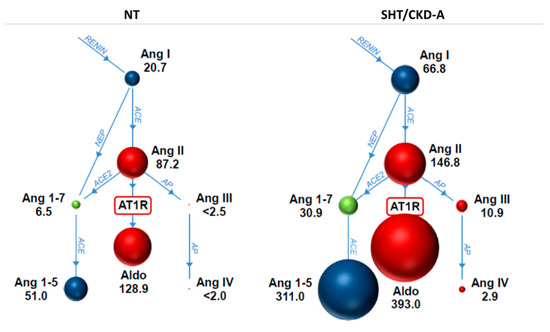 Serum renin–angiotensin–aldosterone system metabolites are shown for normotensive (NT) cats (n = 9) and systemically hypertensive cats with chronic kidney disease treated with amlodipine (SHT/CKD-A) (n = 5). The size of the spheres is proportional to the median concentration of the peptides shown beside the sphere. Enzymes catalyzing metabolite conversions are shown as arrows in light blue. Ang, Angiotensin; ACE, Angiotensin-converting enzyme; NEP, neutral endopeptidase; AP, aminopeptidase; AT1R, angiotensin receptor Type 1; Aldo, Aldosterone.
