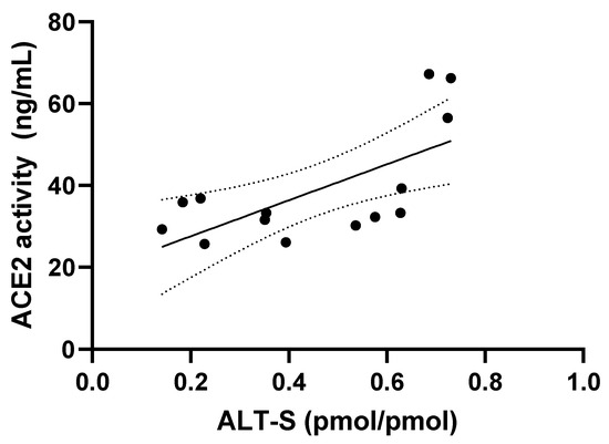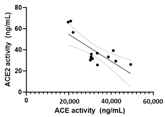 The activity of ACE2 and ALT-S were significantly and moderately positively correlated (rs = 0.62, p = 0.02) (Figure 2). The activities of ACE2 and ACE were significantly and moderately negatively correlated (rs = −0.59, p = 0.03) (Figure 3).