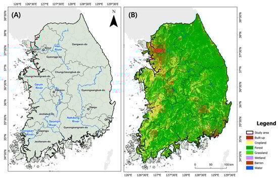 (A) Location of main rivers and cities in South Korea; (B) Land cover of South Korea.
