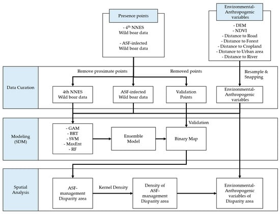 To address these limitations, we applied ensemble SDMs with two types of datasets to estimate the disparities between wild boar habitats and ASF-managed areas. We estimated wild boar habitats using national-scale survey datasets of wild boar traces and ASF-managed areas, that were confirmed as hunting and carcass elimination locations. We compared the spatial information and quantified the disparity areas using kernel density estimation (KDE) [39]. Ultimately, through our estimation of disparities, we could identify areas where management efforts were lacking, and anticipate a decrease in the uncertainty of ASF management.