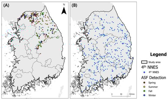 The datasets applied in the study. (A) The 360 locations where the ASF-infected individuals were confirmed, consisting of 360 points. (B) The 360 locations where wild boar traces were detected, generated from the 4th NNES points.